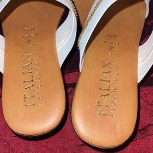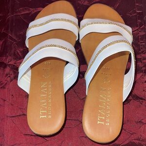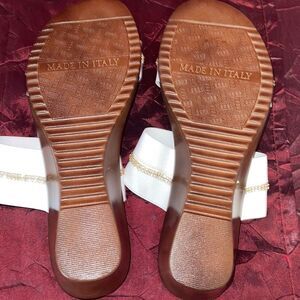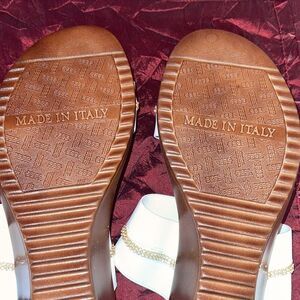 Like new Italian Shoemakers Low Heel Wedges. White elastic straps adorned with a double row of rhinestones. Size 8 1/2 Made in Italy