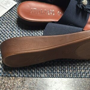 Chic navy sandals with floral accents. Ideal for stylish outings.