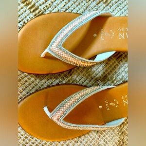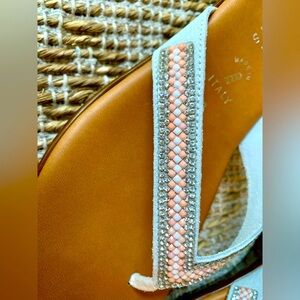 Chic leather upper wedge sandals by Italian Shoemakers, with peach and silver beaded accents, and synthetic sole. Stylish and comfortable for any outing. NWT. A few tiny scuffs on heel (see photos).