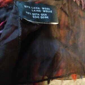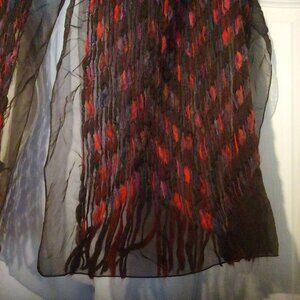 Silk Sheer black scarf with multi color wool threads woven thru the fabric and fringe at the ends.