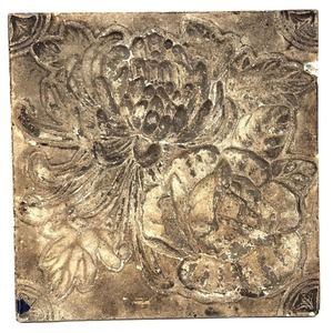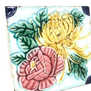 This wonderful vintage tile features colorful pink and yellow flowers with a filagree of leaves around them. This tile would look amazing in a kitchen or bathroom backsplash. There is some wear just around the edges and some on top of the flowers, but it's not bad at al and I believe it just adds to its beautiful vintage charm and appeal.