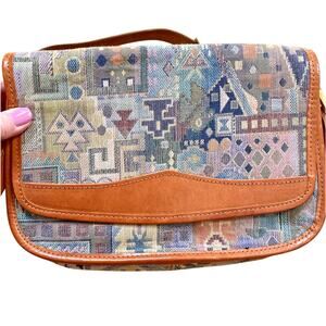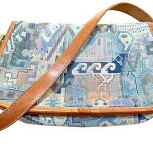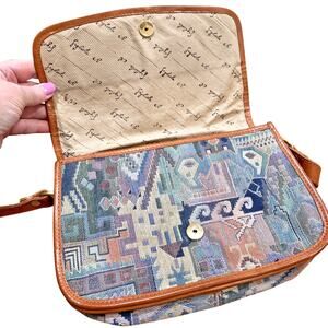 Italian Tapestry Purse 1980s Multicolor & Tan Leather Shoulder Bag Unique Retro