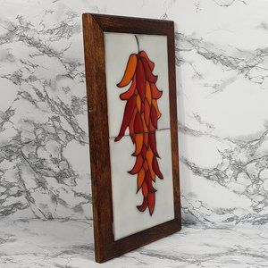 This unique, vintage trivet or wall decor features solid wood construction and is adorned with hand-decorated Italian tiles showcasing a vibrant red pepper design. Versatile and eye-catching, it adds both functionality and Italian charm to any kitchen or dining space.