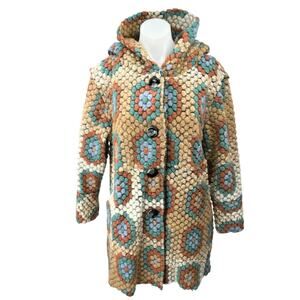 Italian Women's Granny Square Multicolor Floral Hooded Button Coat Jacket Sz S