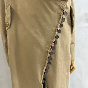 Elevate your style with this stunning Italian coat from Bazar deluxe. Crafted with precision and care, this coat is perfect for women who love to make a statement. The coat features a beautiful beige color, with a size of 46 that fits most women comfortably. It is made with high-quality wool lining material to keep you warm and cozy during cold weather. The coat is designed with a military jacket style, perfect for those who love the edgy look. The silver fox on the coat adds an extra level of sophistication and class. This coat is perfect for any occasion, whether you're headed to work or a night out on the town. Join the Italian fashion trend and add this coat to your wardrobe.