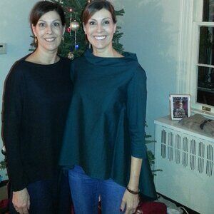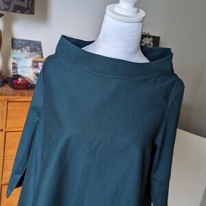 Purchased in Florence, Italy- this is the softest cotton blouse! It is a gorgeous saturated green shade. It has an interesting silhuetted with an angular hemline (longer in back). Made of 95% cotton, 5% elastane. It doesn't really have a size, I wear a size small (34B chest), but this would fit a medium also. The front of the blouse is 21" long, the sleeves are 17.5 inches, the back is 26" inches long. This would also be a great maternity top! Only worn once, it is in excellent condition!