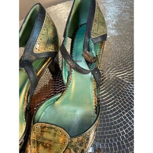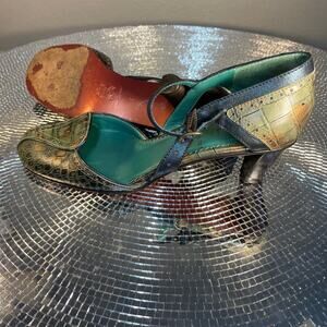 Italian shoes are such a gem. these have some signs of age and wear. the bottoms have some use and the elastic on the buckle part of the shoe is giving out but otherwise these are beautiful and looking for a new home. size 37 great blue green color and such a sweet kitten heel. I cant for the life of me figure out what brand of shoe this is, but being that its made in Italy I know its quality.
