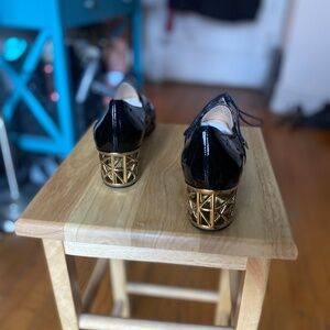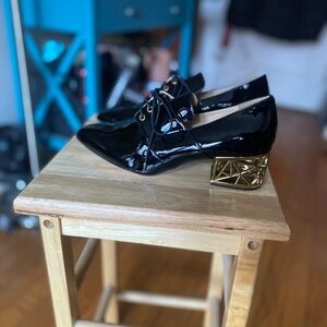 This is a never before worn pair of black patent lace up heeled loafers. The heel is a gold geometric cage detail.