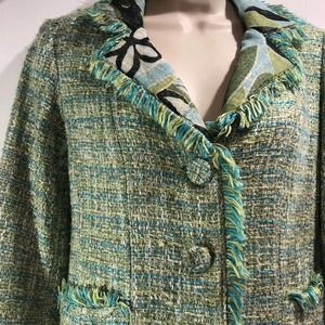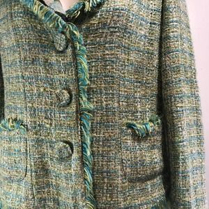 Italian size 40 , with is US size 4 or small. Marc Le Moses button up jacket. Light green and blue tweed. Raw edges. Two front pockets. Fully lined. Made in Italy.