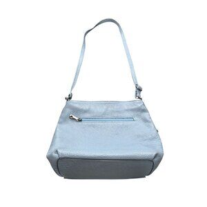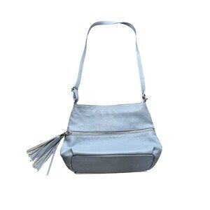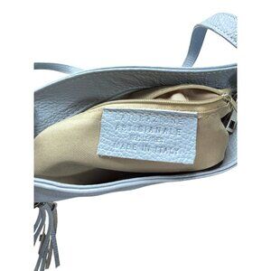 Crafted in Italy, this sophisticated leather shoulder bag offers timeless elegance with its sleek design. Its versatile light blue color complements various outfits. The secure zip closure enhances practicality, while the tassel adds a chic touch, making it a stylish accessory for your collection.