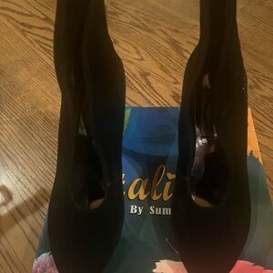 Vintage Elegant black stiletto heels. Perfect for a night out. Features a sleek design. Notice the embroidery design.