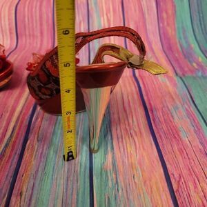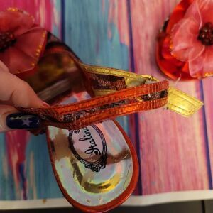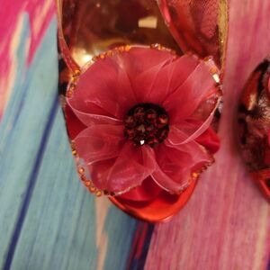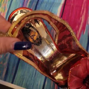These shoes are gorgeous! I don't think that they've ever been worn, although they do look to have some flaws. I've pictured the ones I noticed, such as some of the little stones on the flowers are missing. There are cracks in the gold trim on the inside of the shoe. There are also some cracks on the heel strap of the shoe. I've stretched the elastic on the buckles, and they work fine. There are also some cracks in the red around the buckle.