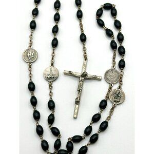 This product is a 25.5-inch black beaded rosary with silver tone accents, originating from Italy. It is a collectible item used for religious purposes in Christianity, specifically for praying the Hail Mary. The craftsmanship and design of this rosary make it a beautiful and meaningful piece for those who practice their faith.