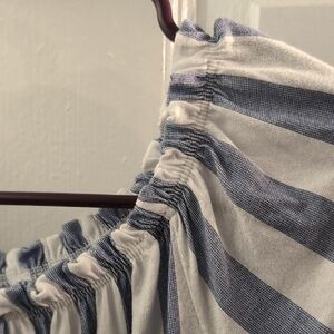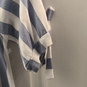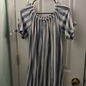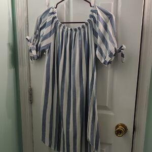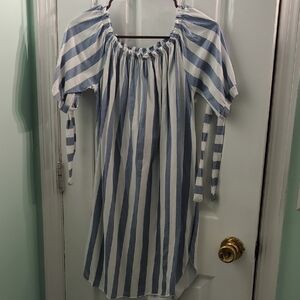 Adorable light weight sundress. blue and white stripes, tie sleeves, and can be worn off the shoulder. one tag says 100% cotton made in Italy.