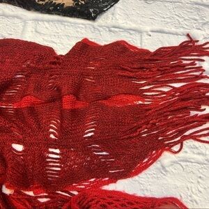 Beautiful dual red colors which allow you to wear the scarf either one side for a deeper red or a more maroon red on the other side with both colors popping through in beautiful twists and delicate designs….both reds are beautiful and the scarf is so soft. This scarf is coiled together and measures unstretched 70 x 11“ approximately this has a lot of stretch to it if you need. Smoke free home