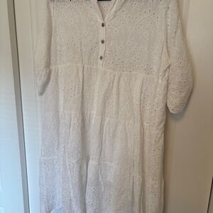 This beautiful, stylish and comfortable white cotton eyelet shift dress has loose scalloped sleeves that reach the elbow, three button front, tiered skirt with scalloped hemline and a built-in inner slip. It's perfect for a casual day out, or as a cover up.