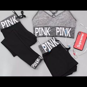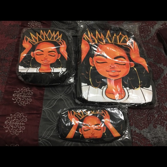 Three and one piece backpacks a purse with lady on front of purse and three piece pink outfits