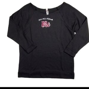 It's All About Me Boat Neck Jersey. Fabric is a lightweight sweatshirt material. Size is S but runs a little loose.