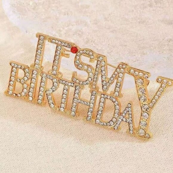 ITEM DETAILS: Brand-new gold-tone & rhinestone lapel pin brooch with the phrase “It’s My Birthday." A great gift for the birthday girl in your life. Measures 3.06” W x 1.42” H. Note: The colorful pin in the last photo is included only to show the size of the pin. You are purchasing the gold one shown in the cover photo.