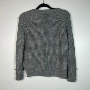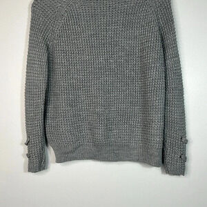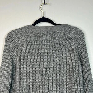 Keywords: It’s Our Time sweater, lace-up V-neck, lace sleeve sweater, gray knit, XS, EUC, trendy fashion, cozy style, fall sweater, winter layering.