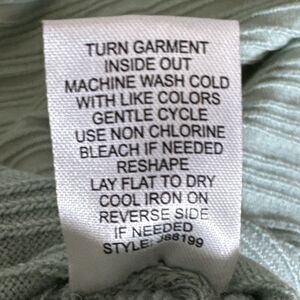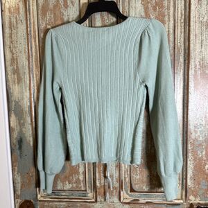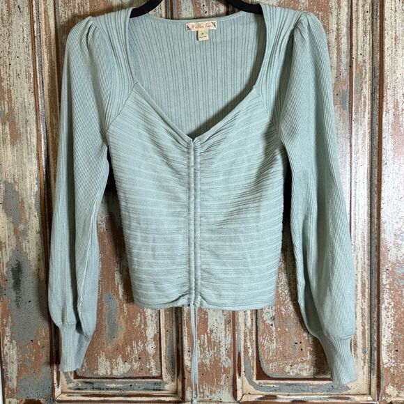 Its Our Time brand Super cute and soft mint green M sweater. Its got a low scooped, neck and drawstrings to adjust the length/crop of the sweater. Great color, great sweater, I see no flaws. Please see photos for details. Pit to pit measurement is about 15 inches and the material is stretchy.