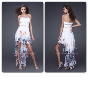 It's a print chiffon high low dress by La Femme..worn once...needs to be dry cleaned