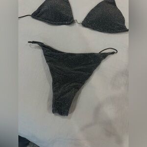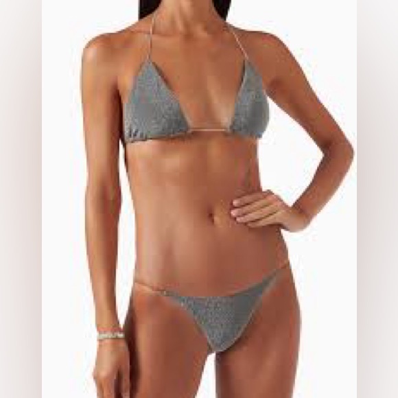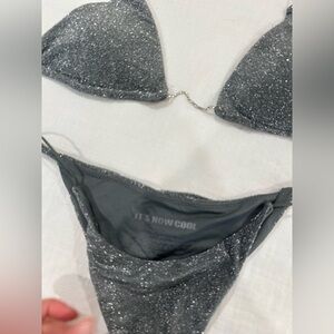 Gorgeous bikini! It’s now cool swim. Silver sparkly material with domain halter. Size small in both top and bottom. I pulled off the tags premature it was a little too small on me so I didn’t end up wearing it. Stunning bikini tho