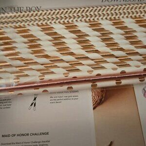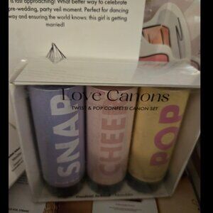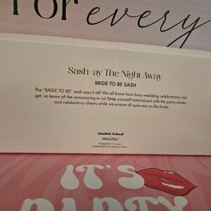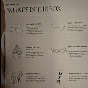 Subscription box for miss to Mrs Bridal. Everything is included. Box only opened for pictures. Northing has been used. Bride to be sash with pin. Love cannon poppers. Photo props. Dancing queen party veil. Bride to be Balloons. Rose colored paper straws.