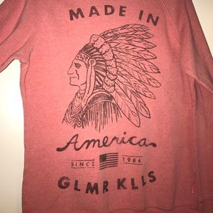 The sweater is salmon with the graphic design of an Indian chief with the words "Made in America" and "GLMR KLLS"