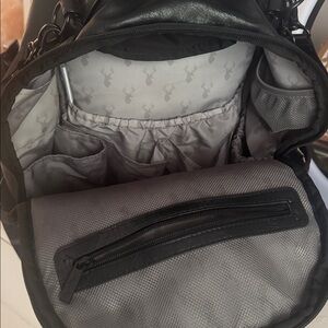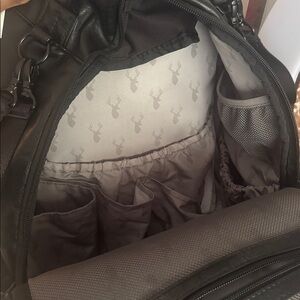 The Cole backpack includes coordinating stroller clips and an easy-wipe changing pad featuring a stag head that matches the print on the interior of the backpack. The changing pad has its own zippered pocket on the back of the bag, perfect for keeping it separate from the other contents of the bag and providing extra cushion when wearing the backpack! If you're using the backpack as a work bag, this zippered pocket is perfect for storing a laptop or notebooks