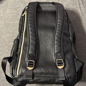 Stylish black leather backpack featuring gold accents and a chic design. Perfect for everyday use.