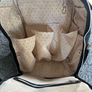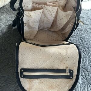 Changing pad in the back pocket. Insulated side pockets for bottles / cups. Multiple pockets everywhere. It’s a great bag but I always veer to my white one so this is just sits there.