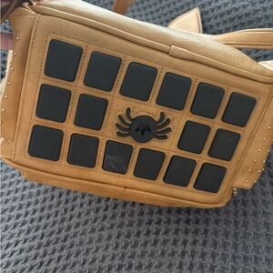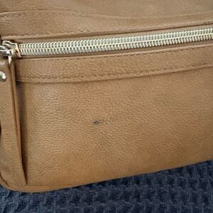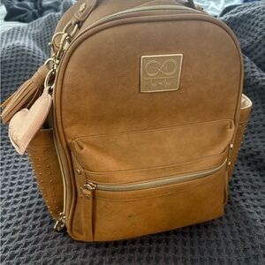 Chic tan backpack with gold hardware. Features front zipper pocket and side compartments. Ideal for daily use. Including mama keychain which retails for $15 Excellent used condition