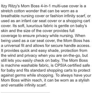 Itzy Ritzy Mom Boss 4 in 1 multi-use car seat cover, nursing cover, shopping cart cover and infinity scarf in lightening bolt pattern. Excellent condition, stock photos used to show different use options and details of product, actual item is the lightening bolt pattern. Please see photos for approximate measurements and details. Item may show a difference in color based upon photography and perception. Photos are part of the description, as everyone’s level of condition may vary. From smoke free and pet free home. All packages are shipped the same or next business day.