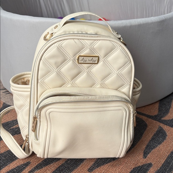 Elegant quilted backpack with bee-patterned interior. Perfect for daily use.