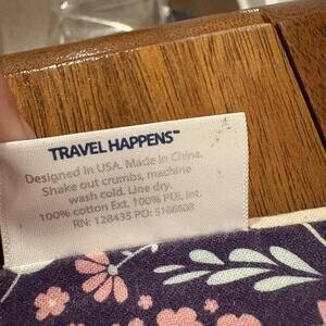 Light wear, minor signs of use. Interior lining is clean with no tears noted. Zipper and snap function properly. Print remains vibrant. Small specks/marks visible on the care tag as shown; no other flaws observed.