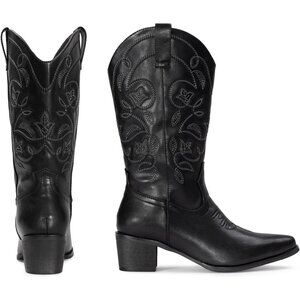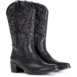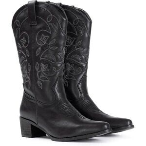 Iuv Cowgir Mid Calf Boot Women Black Faux Leather Pointy Toe Not Water Resistant