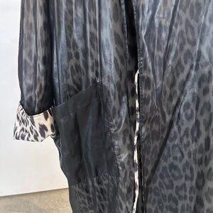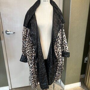 Bold reversible raincoat by Ivan Grundahl — leopard print one side, tonal black the other. Featuring a dramatic wide collar, drawstring hem, and oversized silhouette typical of Grundahl's avant-garde style. Super light! Lots of ties and drawstrings. Size appears generous/one-size; beautifully crafted, a standout statement piece. Excellent condition!!