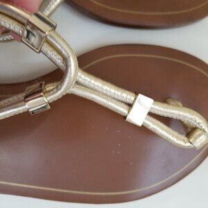 Women's size 10M Ivanka Trump gold "Ashanti" flat sandals are gladiator-style, with adjustable leather straps and man-made soles. Great for work, going out, and for easy walking no matter where you are. Whether dressed up or dressed down, the gold hardware on these is sure to turn heads. These sandals will come with their original box, and are in overall excellent condition.