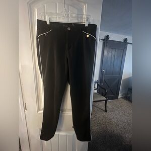 Compression Pants boasts a line contrasting trim on each pant leg making you stand out from the crowd. Pants is ankle length with scoops around ankle as well. Beautiful gold button embellishments on front pockets and has an inseam of approximately 27.5”.