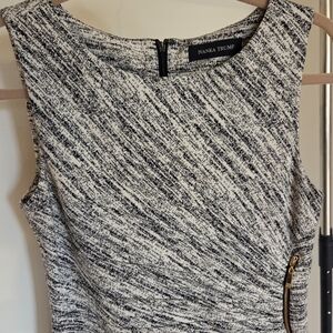 this a perfect work or school black and white midi dress. Great textured fabric with a modern design. warm, fitted, really nice stretchy material. you will not be disappointed.
