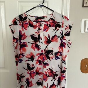 This striking blouse from Ivanka Trump features a bold floral print in vibrant red, pink navy blue and black hues. The lightweight fabric and flowing design make it a perfect choice for a casual yet stylish look.