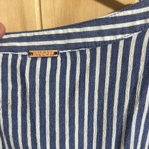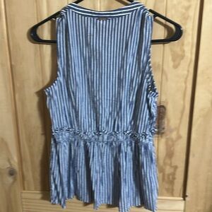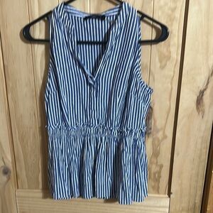 This elegant blouse features a sleeveless design with a smocked detail, offering a chic and comfortable fit. The alternating blue and white stripes add a touch of sophistication, making it perfect for both business and casual settings. Crafted with precision, this top ensures a polished and refined look.