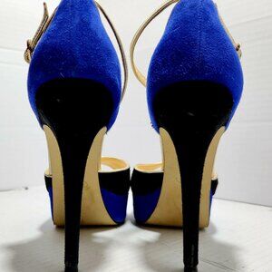 Ivanka Trump Kyra2 d'Orsay style, beautiful black and royal blue suede with gold detailing, peep-toe platform high heels. Like new, still in box only worn once or twice. The only visible signs of wear are on the bottom soles, pictured. Women's size 7M