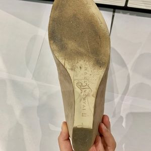 A slim line of trim enhances a sleek pump lifted by a covered wedge heel.