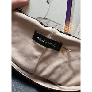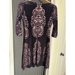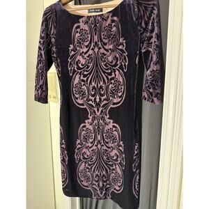 This is a whimsical Ivanka Trump dress in a size 6 featuring a purple medallion damask design with 3/4 sleeves. The dress is styled as a sheath and made of a polyester blend fabric with a velvet burnout finish. It has a fairy character inspiration and a short dress length.