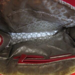 Reddish (with a hint of pink) handbag with detachable long strap, this bag is large. Very sturdy, it's on the heavier side and made with few details, the ones that are present are gold with the designer's name. It appears unused, the inside is perfectly clean with a phone pocket. too small pouch pockets and a zippered pocket. It needs to be used to "soften" the "leather", other than that. it's an attractive purse. About 13-1/2" x 11"