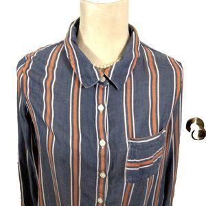 Womens Top/ Shirt Striped Button Front Tie Knot Roll Tap Sleeve Blue