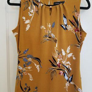 Size small, women's Ivanka Trump floral sleeveless blouse in mustard now available. Includes cute pleating around the neckline, and a rose gold embellishment on the collar. True to size, good used condition.