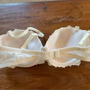 This beautiful white natural white wedding lingerie is in excellent condition. No flaws as I can see. It is padded, the straps can be crossed over, taken off or replaced with see-through straps (those are very soft and smooth, not cheap-feeling!) Let me know if you have any questions.